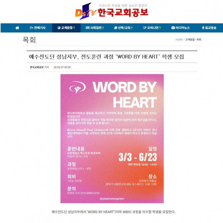 [기사] 예수전도단 성남지부, 전도훈련 과정 ‘WORD BY HEART’ 학생 모집(한국교회공보)